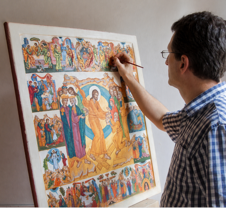 In het atelier staat de eeuwenoude traditie van iconenschilderkunst centraal. Iconen worden hier niet alleen gezien als kunstobjecten, maar als “vensters op het goddelijke”: beelden die uitnodigen tot bezinning, verstilling en ontmoeting met het heilige. Tegelijkertijd vertaalt Atelier Hüsstege deze traditie naar een hedendaagse context, waarin kwaliteit, toegankelijkheid en vakmanschap samenkomen.
